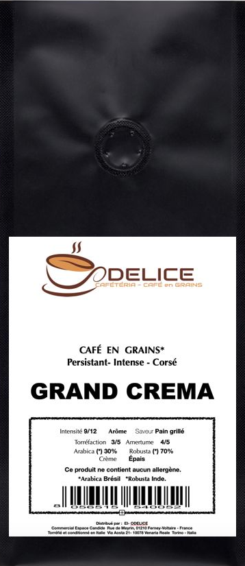 La composition principale du Grand Créma de Odelice se compose de Robusta, de cafés indiens et vietnamiens, ainsi que de 30 % d'Arabica provenant du Brésil. Il offre un parfum puissant et une saveur robuste. C'est le mélange préféré le plus fréquemment employé dans la distribution automatique.