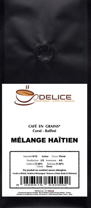 Le mélange Odelice Haïtien est un assemblage qui se compose à parts égales d'Arabica provenant d'Amérique du Sud (Brésil et Nicaragua) et de Robusta provenant d'Asie (Inde et Vietnam). Ce mélange spécifique offre une belle crème teinte noisette et un goût délicat et durable, à essayer sans faute.