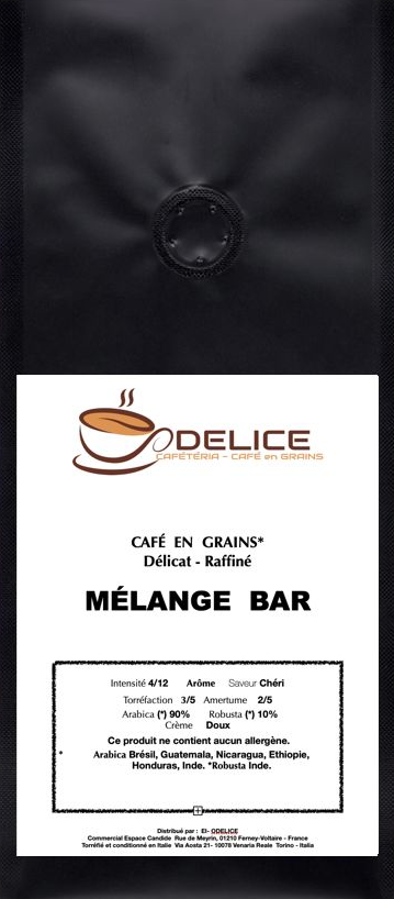 Le Mélange Bar de Odelice est l'un des produits les plus emblématiques de la collection historique. Notre clientèle apprécie ce mélange, conçu et perfectionné au fil des années. Ce mélange est constitué à 90 % d'Arabica, incluant des variétés de café originaires du Brésil, du Guatemala, du Nicaragua, d'Éthiopie, du Honduras et de l'Inde. Il inclut aussi 10 % de Robusta provenant d'Inde. L'amélioration de son goût nous a valu la médaille d'or 2018 décernée par l'Institut international des dégustateurs de café, dans la section Espresso italien.
